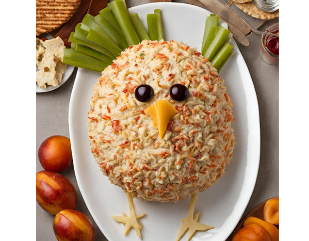 To create the turkey's eyes, place the olive halves carefully on the cheeseball.
